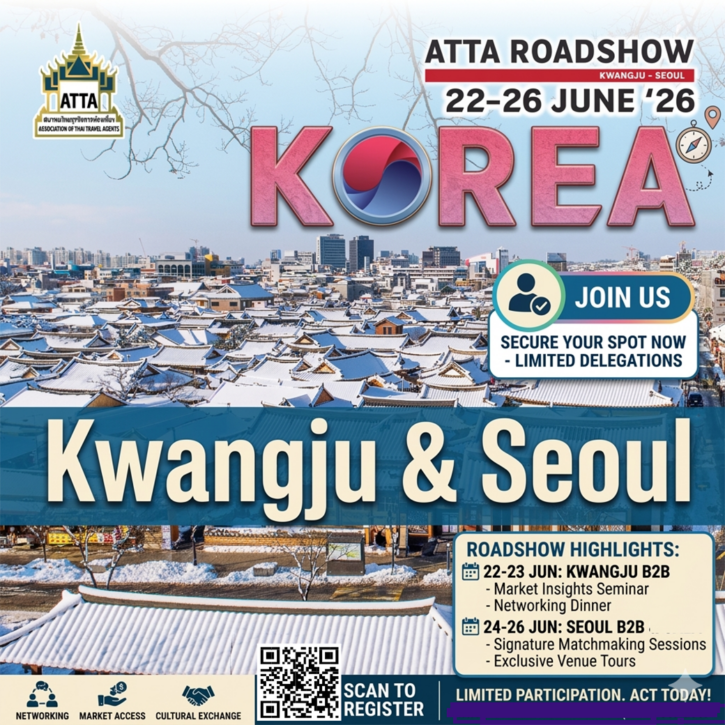 สมาคมไทยธุรกิจการท่องเที่ยว (ATTA) ขอเรียนเชิญท่านเข้าร่วมกิจกรรม ATTA Roadshow ณ ประเทศเกาหลีใต้ ซึ่งจะจัดขึ้นระหว่างวันที่ 22–26 มิถุนายน 2569 นี้